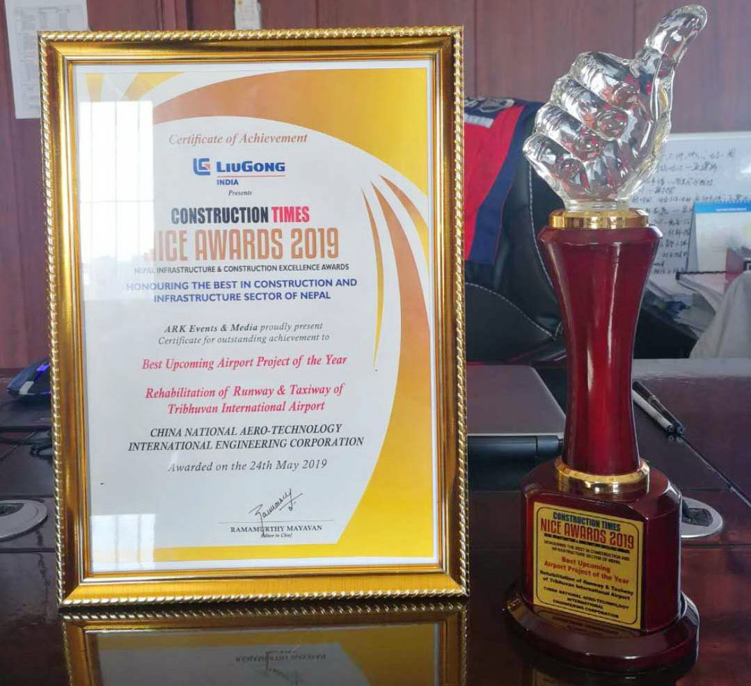 Recently, the result of Excellence Award with the intention of honoring the best in construction and infrastructure sector of Nepal was announced and the Rehabilitation of Runway & Taxiway of Tribhuvan International Airport in Kathmandu undertaken by our company was awarded with the “Best Upcoming Airport Project of the Year”. The Minister of Infrastructure and Transport of Nepal conferred this award to our company.