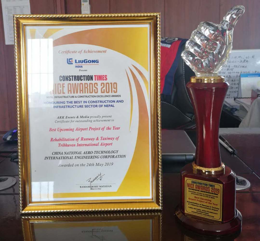 Recently, the result of Excellence Award with the intention of honoring the best in construction and infrastructure sector of Nepal was announced and the Rehabilitation of Runway & Taxiway of Tribhuvan International Airport in Kathmandu undertaken by our company was awarded with the “Best Upcoming Airport Project of the Year”. The Minister of Infrastructure and Transport of Nepal conferred this award to our company.